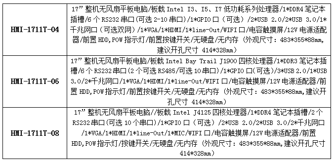 HMI-1711T是一款配置17” LCD 液晶屏的低功耗工業級平板電腦,采用Intel® Atom J1900/J4125 四核低功耗處理器,具有豐富的I/O 接口,可廣泛應用于如電氣測試校驗臺、煙草物流檢測設備、橡膠機械、測試設備等領域。